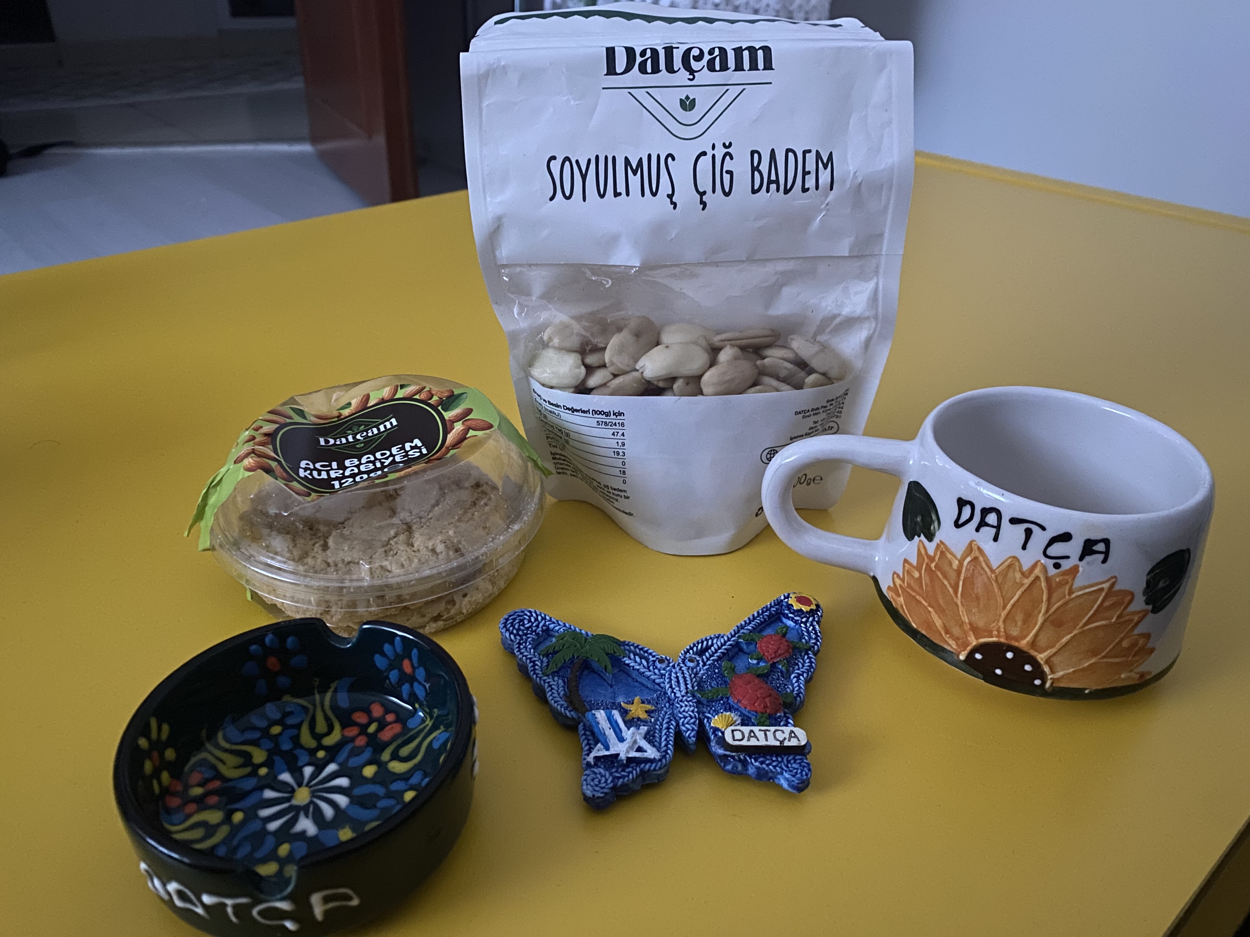 Datça’da neler yapılabilir kısmına gelirsek, Datça /Merkez ‘de organik ürünler satan mağazaya girebilir, bademi ile ünlü beldenin bademle özdeşleşmiş ürünleri (bademli kahve, bademli kurabiye, helva vb.) satın alabilirsiniz. Ben aşağıda görselini paylaşmış olduğum üzere ; magnet, porselen fincan, küllük ve çiğ badem satın aldım ayrıca Adaçayı alınmadan da geçilmez diye düşündüm :)Sonrasında arkadaşım Ahmet’le sahilde oturup çaylarımızı yudumladık. Hoş, otantik bir yerdi. Daha sonra Datça /Merkezde yer alan Ilıca Gölüne geçtik.Bu göl, içerdiği mineraller sayesinde şifalı olarak bilinmektedir. Burayı otelde tanıştığım, arkadaşım diyebileceğim Ahmet sayesinde keşfetmiş oldum. Kendisine buradan kalp gönderiyorum ♥ iyi ki tanıdım. Vakit kısıtlı olduğu için çok yer gezemedim ancak ünlü şair Can Yücel’in bulunduğu sokağı ve evinin kapısını sizin için fotoğrafladım. İçeri girmek ne yazık ki güvenlik gerekçesiyle yasaklanmış.